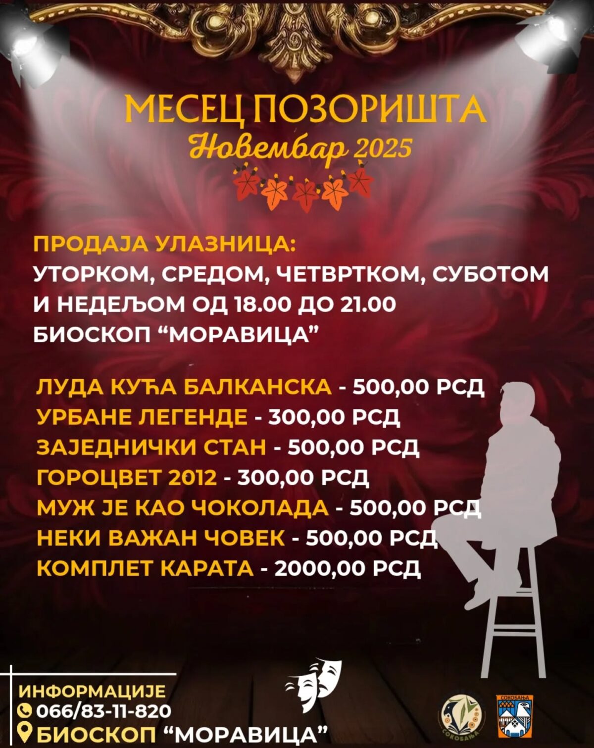 Početak svih predstava je u 20 sati na sceni bioskopa “Moravica” a cene pojedinačnih ulaznica su 300 i 500 dinara, u zavisnosti od predstave, a komplet karata za sve predstave je 2.000 dinara.