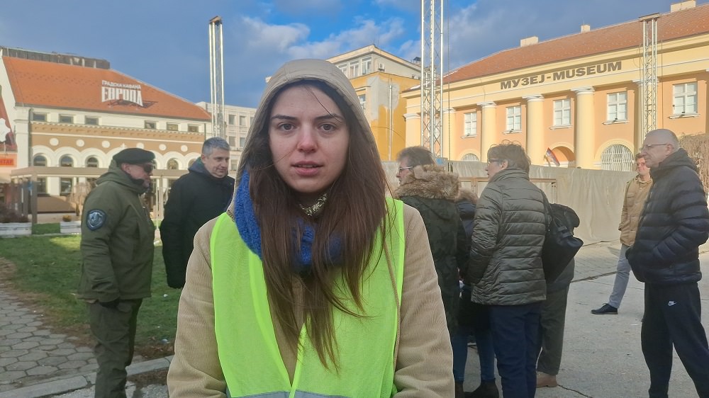 “Ovde smo se okupili u ime studenata, sakupljamo potpise građana, kao podršku studentskom zahtevu za raspisivanje vanrednih paralmentarnih izbora”, kaže Mina Nikolić, student književnosti.