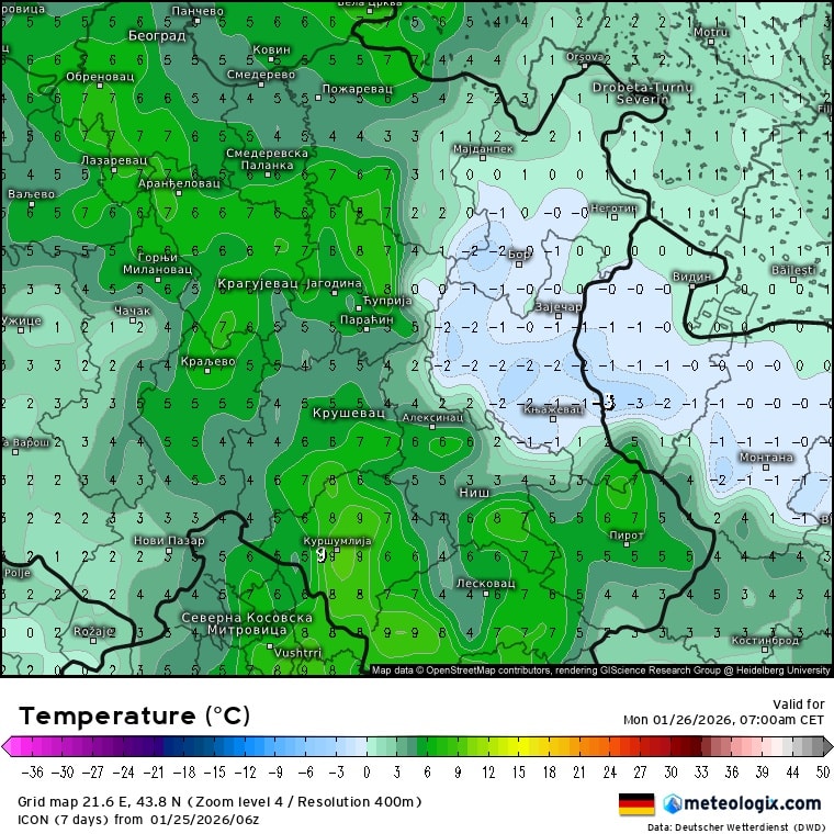 Debeo invezioni sloj na istoku Srbije i dalje je stacioniran i tek će sutra popodne polako popuštati. U međuvremenu kiša koja se sutra očekuje u toku dana u delovima sa temperaturom u minusu će se lediti pri tlu. Najugroženiji delovi će biti brdsko-planinski delovi u okolini Knjaževca. U večernjim satima se očekuje da i tim delovima temperatura polako ide u plusu, navodi Meteo Knjaževac na svojoj fb stranici.
