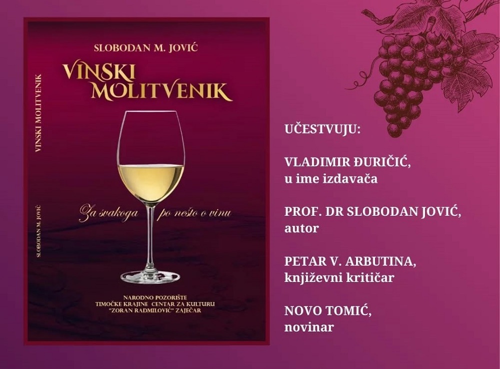 Promocija knjige “Vinski molitvenik” biće održana u utorak 10. februara, a ovom prilikom gost Pozorišnog muzeja u Zaječaru biće jedan od najvećih stručnjaka iz oblasti vinarstva sa ovih prostora, prof. dr Slobodan Jović.