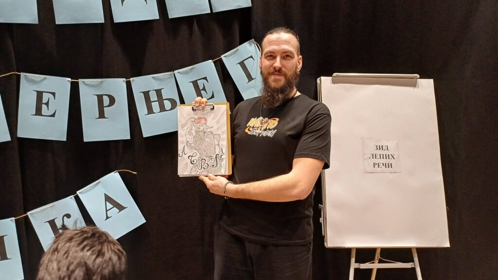 Milan Jazbinšek, mentor radionice stripa, svojim fantastičnim crtežom Vuka Karadžića i početnih slova azbuke oduševio je i decu i sve prisutne. Miloš Đorđević je takođe bio podrška deci sa radionice stripa, a Anastasija Petrović, mentorka radionice fotografije sve je beležila fotoaparatom. Mladi novinari su bili posebno kreativni jer je pisana reč njihov fah i bioskop je danas bio mesto kreativnosti, mašte i ljubavi prema srpskom jeziku.