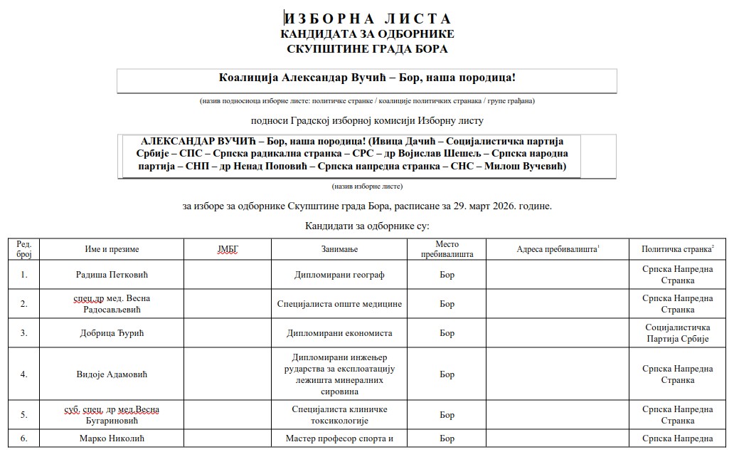 Na listi se nalazi 35 kandidata za odbornike koji će se boriti za mesta u budućoj Gradskoj Skupštini, a građani će moći da glasaju 29.marta na lokalnim izborima na 47 biračkih mesta na području grada Bora.