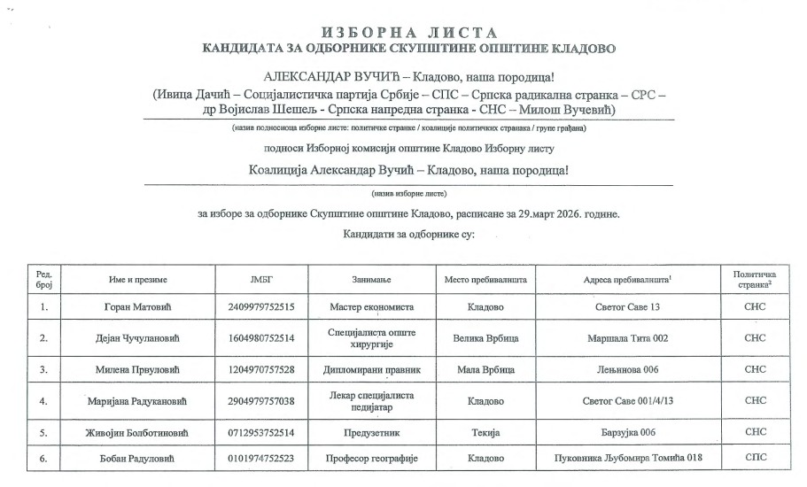 Nakon što je Opštinska izborna komisija detaljno pregleda dokumentaciju verifikovala je izbornu listu „Aleksandar Vučić – Kladovo naša porodica“. To je prva potvrđena izborna lista za predstojeće izbore u opštini Kladovo i na glasačkom listiću biće pod rednim brojem jedan.