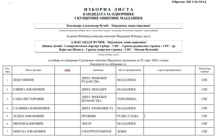 Listu pod nazivom “Aleksandar Vučić – Majdanpek, naša porodica” sa imenima 31 kandidata, koliko odbornika broji lokalni parlament u Majdanpeku, svojim potpisom podržalo je 1255 punoletnih građana.