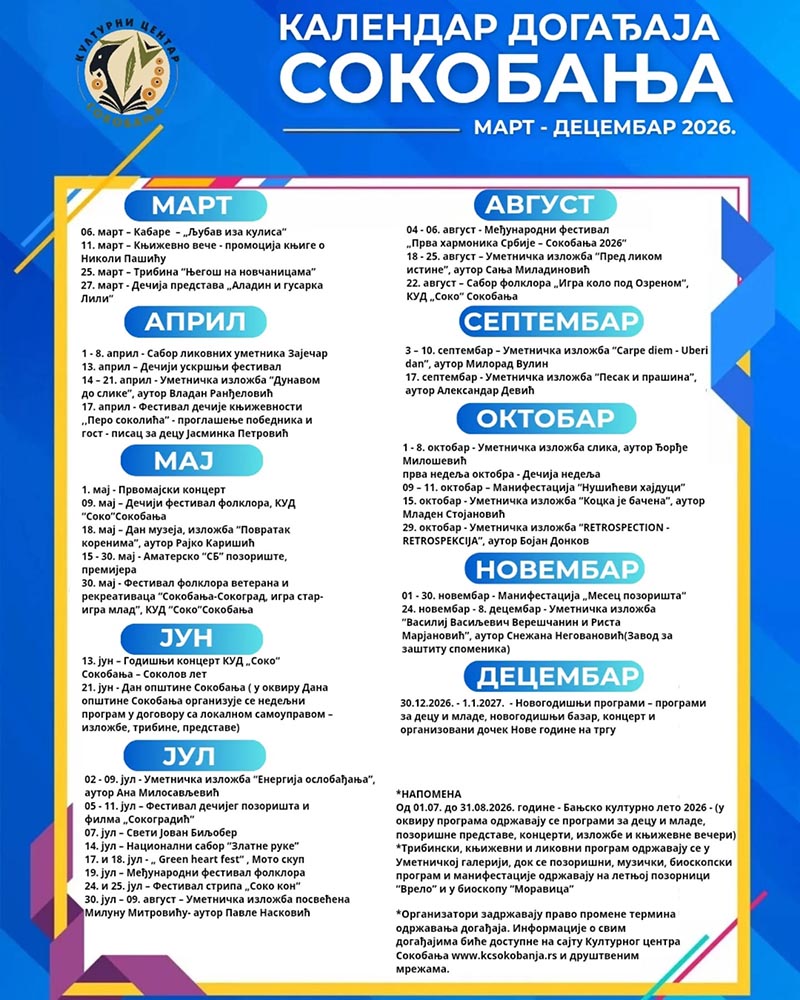 Kulturni centar Sokobanja objavio je kalendar kulturnih dešavanja do kraja godine, skrojen po ukusu meštana i gostiju ove najposećenije banje na istoku Srbije.